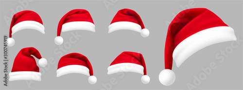 The watermark will not be included on Canvas Print.: Realistic set of red santa hats - new year red hat - - stock vector -