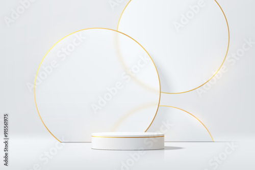 The watermark will not be included on Canvas Print.: Realistic white 3d cylindrical podium background with floating overlap circles gold lines - minimalis