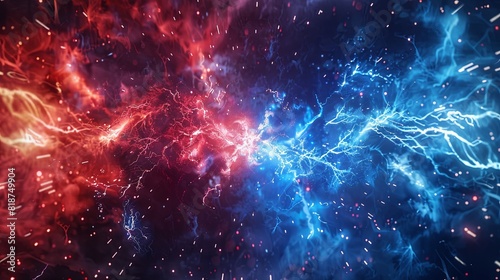 The watermark will not be included on Canvas Print.: Red and blue lightning clash in the center of an abstract background
