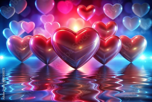 The watermark will not be included on Canvas Print.: Red hearts floating in neon water with reflections