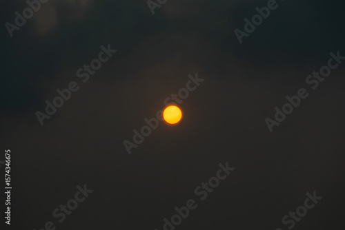 The watermark will not be included on Canvas Print.: Red orange sun through the hazy clouds -