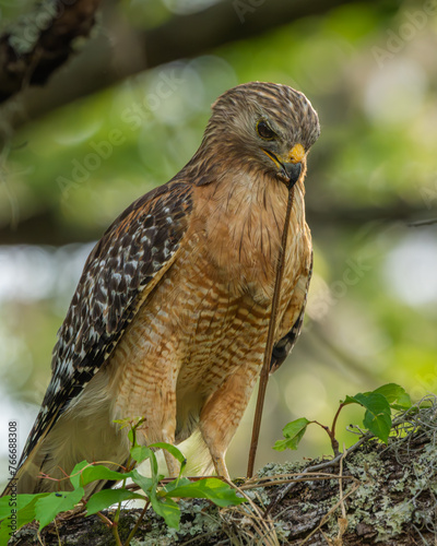 The watermark will not be included on Canvas Print.: Red shoulder hawk perched on a tree branch eating a snake