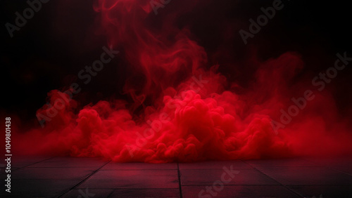 The watermark will not be included on Canvas Print.: Red smoke on the floor - isolated black background - foggy fog effect texture overlays for text or spa