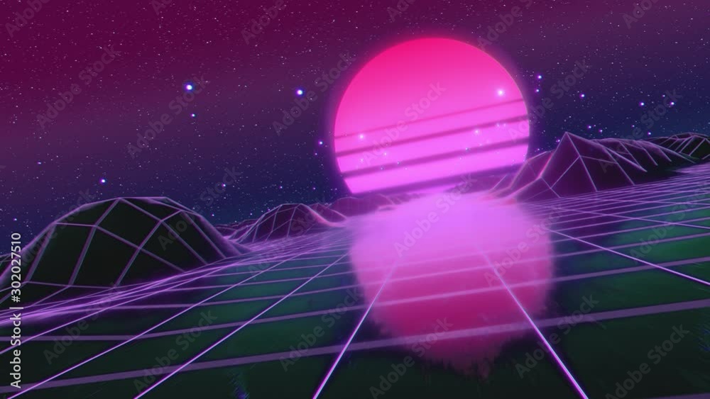 The watermark will not be included on Canvas Print.: Retro futuristic flight in space with a polygonal mesh on the generated hills and floor - concept 80s