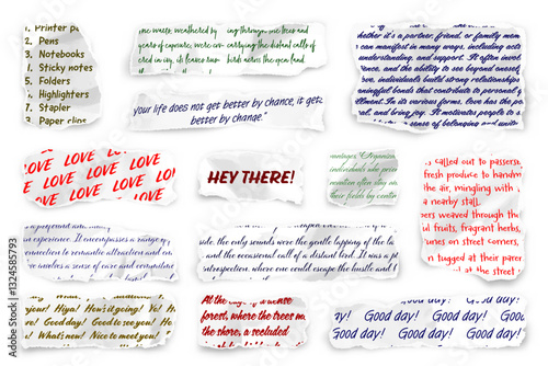 The watermark will not be included on Canvas Print.: Ripped paper strips with handwritten text - realistic crumpled paper scraps with torn edges - shreds o