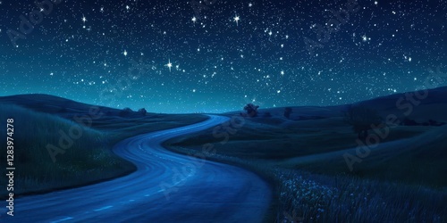 The watermark will not be included on Canvas Print.: Road with a blue stripe and a field of grass