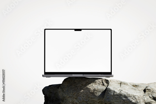 The watermark will not be included on Canvas Print.: Scene with a opened laptop with a white blank screen on the rock