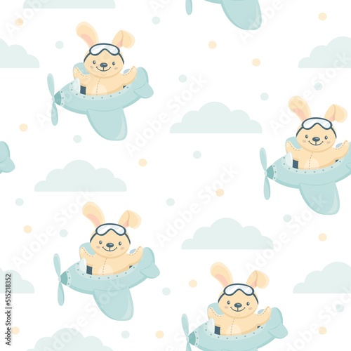 Canvas Print : Seamless vector pattern - cute little bunny flying in an airplane among the clouds - pattern for child