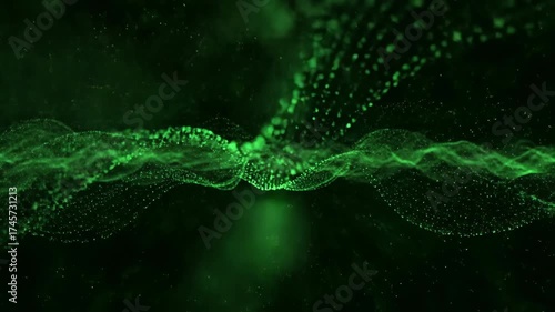The watermark will not be included on Canvas Print.: Seamlessly looping video of glowing green energy particles flowing and merging in abstract space bac