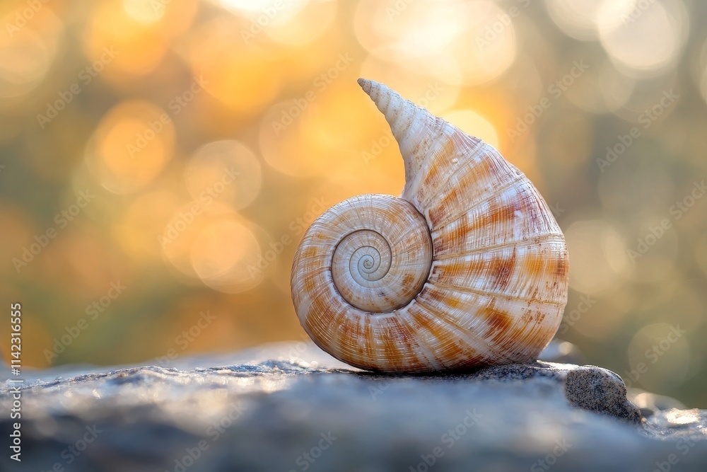 The watermark will not be included on Canvas Print.: Seashell with spiral pattern on a rock at sunset -