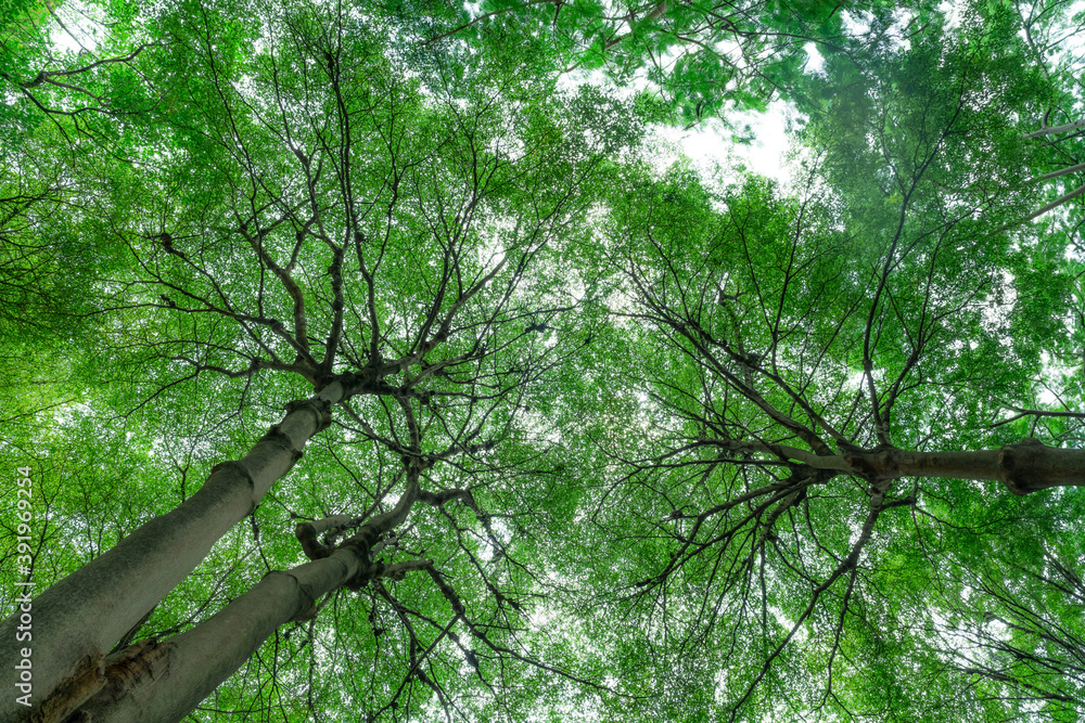 Canvas Prints selective focus on tree in park. bottom view of tree trunk to green leaves of tree in tropical fores