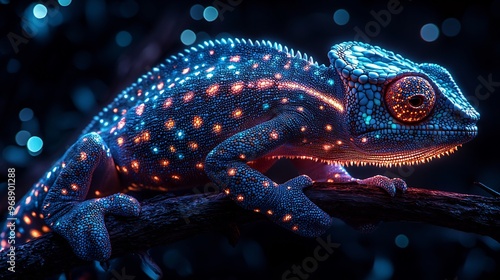 The watermark will not be included on Canvas Print.: Semiabstract chameleon with neon patterns shifting across its body symbolizing adaptability and chan