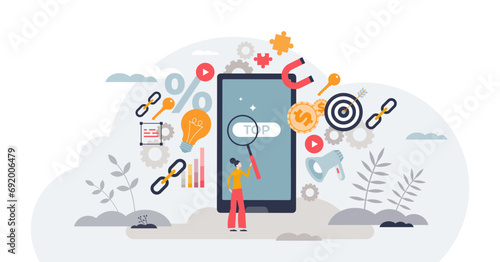 The watermark will not be included on Canvas Print.: Seo and mobile optimization for marketing efficiency tiny person concept, transparent background - bu