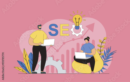 The watermark will not be included on Canvas Print.: Seo optimization concept with modern flat design for web - man and woman making search settings and a