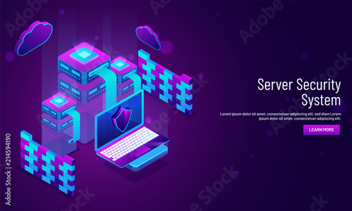 The watermark will not be included on Canvas Print.: Server security system concept based landing page design with isometric illustration of servers and