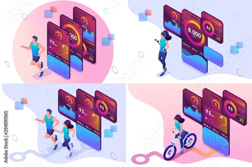 Canvas Print : Set isometric workout concepts girls and men uses a mobile app to track your workouts - for website a