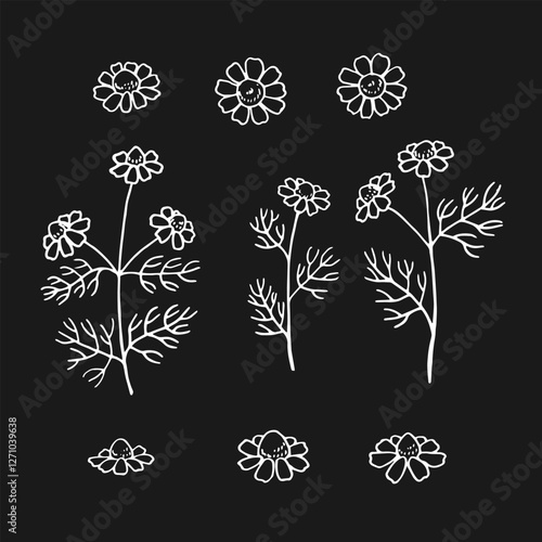 The watermark will not be included on Canvas Print.: Set of chamomile - hand drawn vector illustration in outline style -