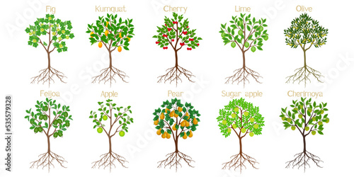 The watermark will not be included on Canvas Print.: Set of fruit trees with roots on a white background -