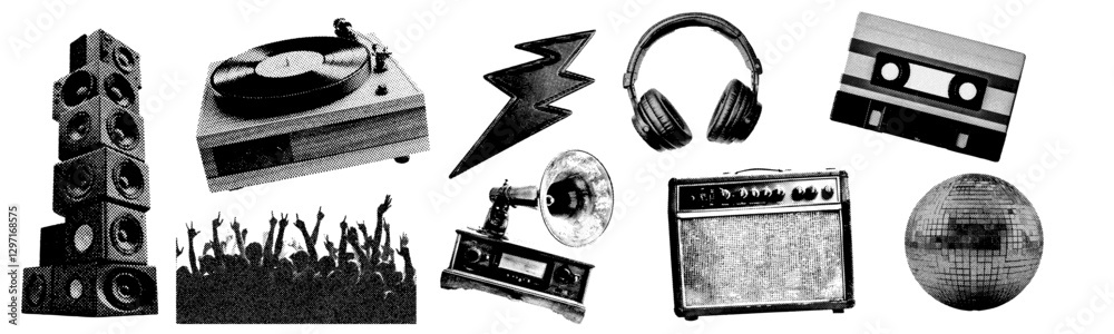 The watermark will not be included on Canvas Print.: Set of music and instrument halftone grunge vector design elements