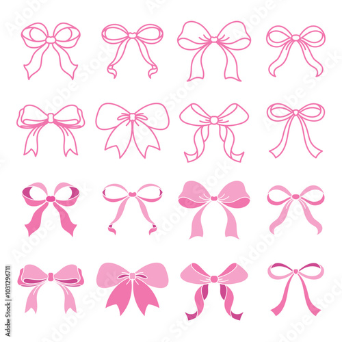 The watermark will not be included on Canvas Print.: Set of pink ribbon bows in vector illustration with outline and flat color options - hand-drawn in a
