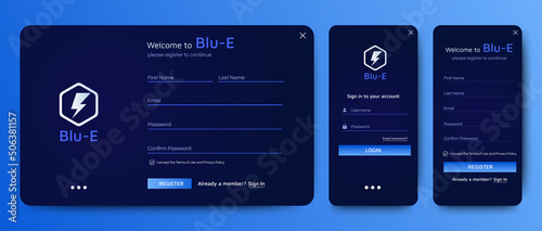 The watermark will not be included on Canvas Print.: Set of sign up and sign in forms - blue gradient background with modern logo - registration and login