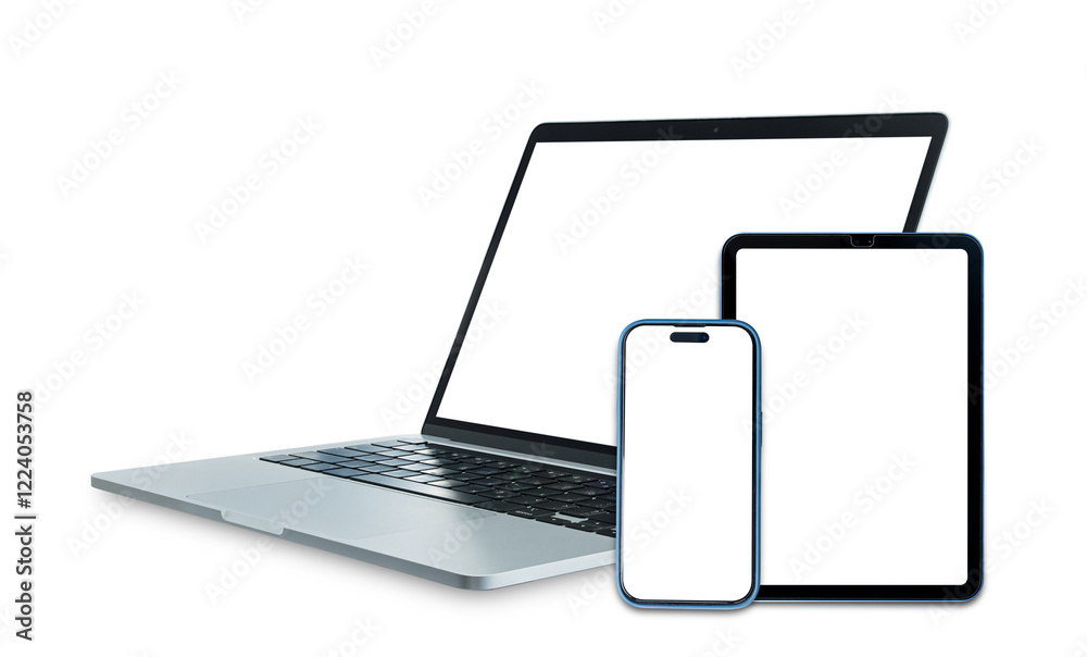 The watermark will not be included on Canvas Print.: Set of smart devices smartphone, tablet and laptop with blank screen isolated on transparent backgro