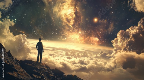 The watermark will not be included on Canvas Print.: Silhouette of a person gazing at a starry sky with a nebula in the background