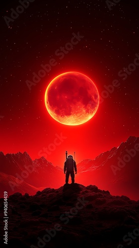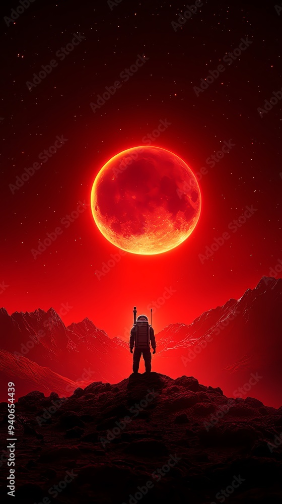 The watermark will not be included on Canvas Print.: Silhouette of astronaut standing on a red planet with a large red moon in the sky -