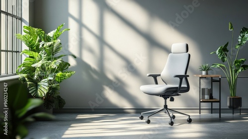 The watermark will not be included on Canvas Print.: Single ai-driven ergonomic chair in a minimalist home office, ample copy space for text or design ar
