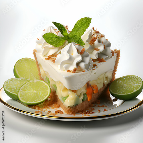 The watermark will not be included on Canvas Print.: Slice of lime cake with whipped cream and mint on white background