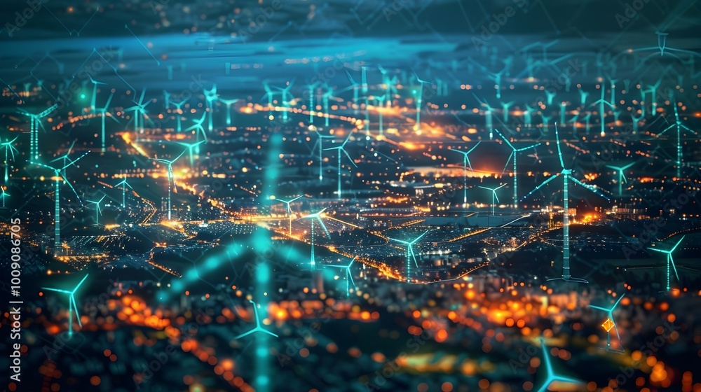 The watermark will not be included on Canvas Print.: Smart grid interface visualizing energy flow between wind turbines solar farms and urban areas