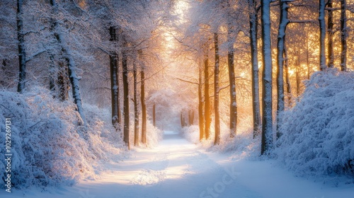 The watermark will not be included on Canvas Print.: Snow-covered trees in a serene forest during early morning with soft light filtering through the bra