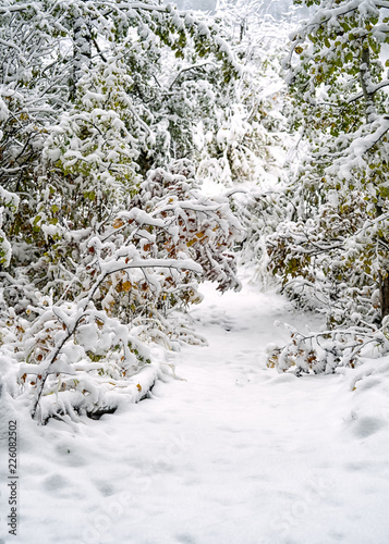 The watermark will not be included on Canvas Print.: Snow falling on tree boughs along a forest path -