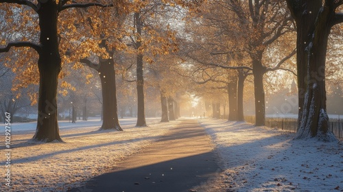 Canvas Prints snow gently falling on a quiet park, with soft light filtering through the trees