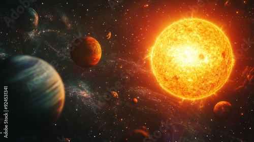 The watermark will not be included on Canvas Print.: Solar system with planets and moons orbiting the sun, fantasy space background with swirling cosmic