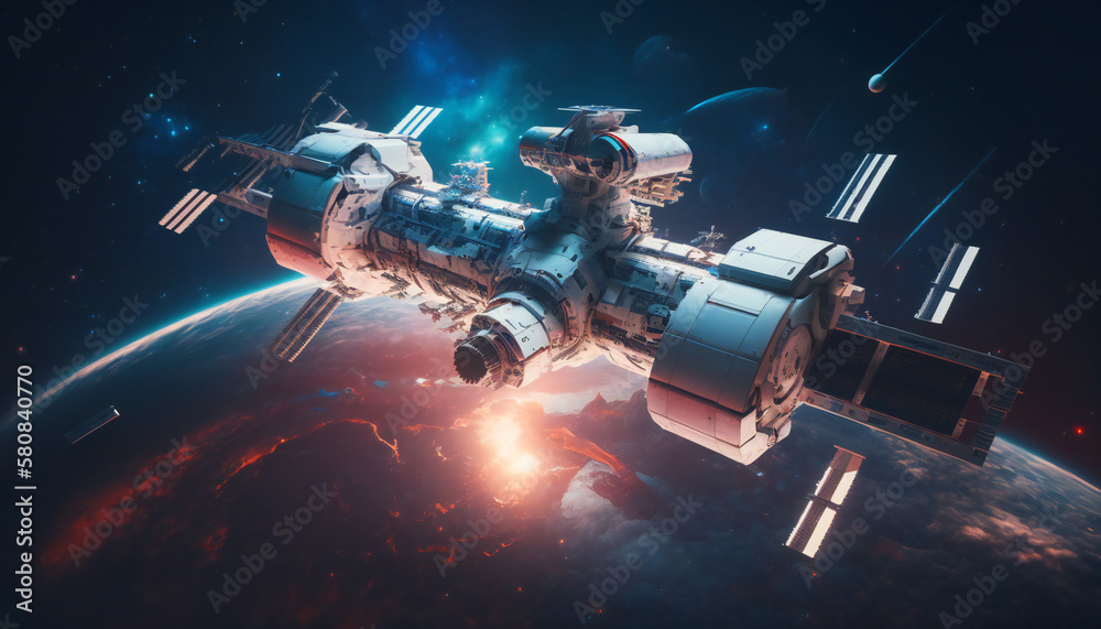 The watermark will not be included on Canvas Print.: Space station in outer space - space wallpaper - generative ai