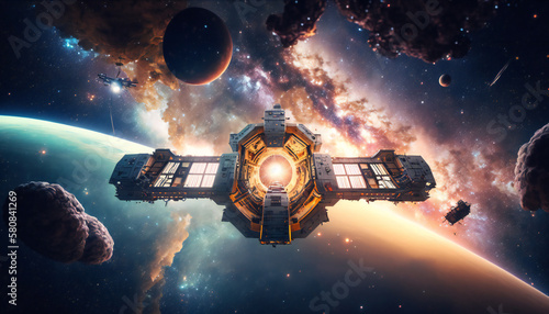 The watermark will not be included on Canvas Print.: Space station in outer space - space wallpaper - generative ai