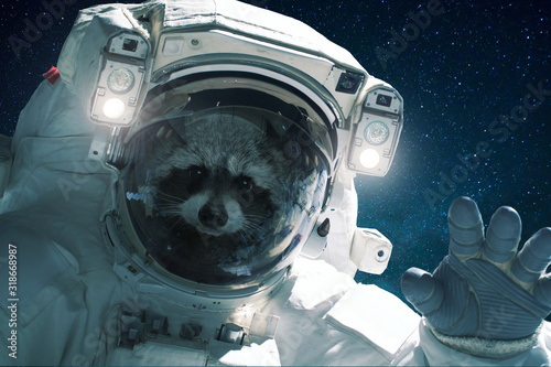 Canvas Prints spaceman raccoon in a spacesuit waves his hand. animal in outer space, concept