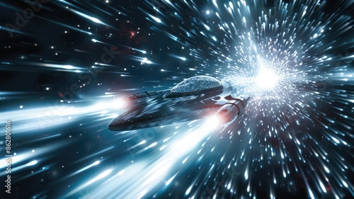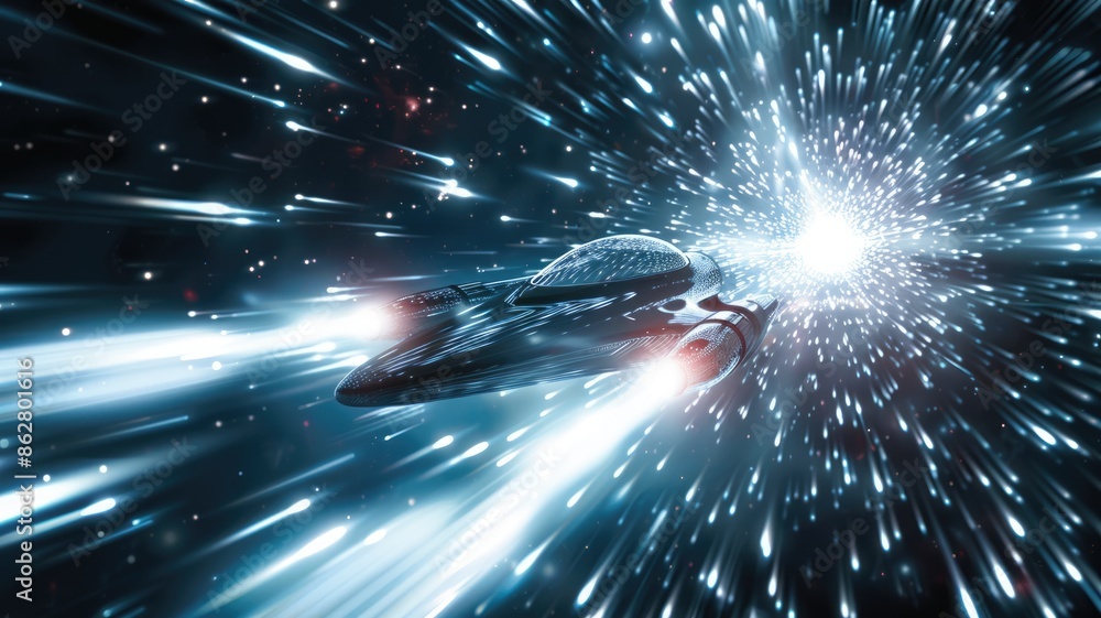 The watermark will not be included on Canvas Print.: Spaceship flying through space with stars and galaxies in the background - concept of space explorati