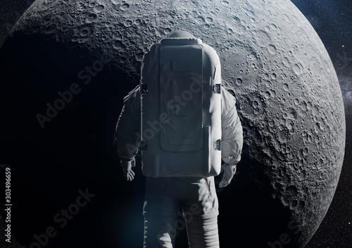 The watermark will not be included on Canvas Print.: Standing astronaut in front of the moon