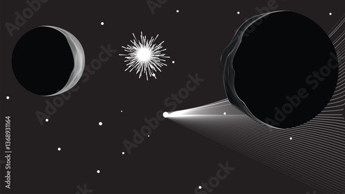 The watermark will not be included on Canvas Print.: Star and moon and comet in outer space - futuristic landscape, with lines texture - space landscape w