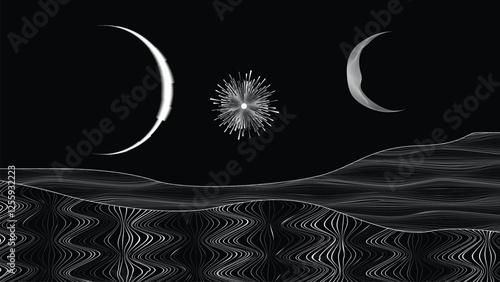 The watermark will not be included on Canvas Print.: Star and moon in outer space - futuristic landscape, with lines texture - space landscape with moon a