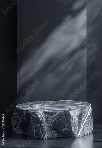The watermark will not be included on Canvas Print.: Stone podium with smoke in the background empty dark marble table podium in the center of a dark roo