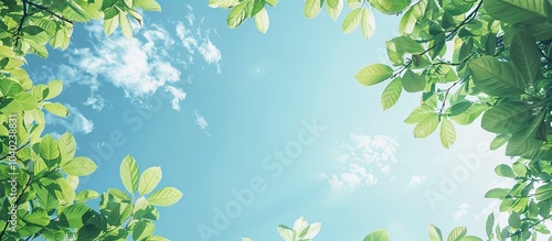The watermark will not be included on Canvas Print.: Summer blue sky and forest tree leaves create a serene background for the copy space image