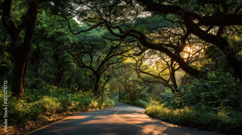 The watermark will not be included on Canvas Print.: Sun shines through trees arching over a winding road in a lush forest - great for illustrating nature