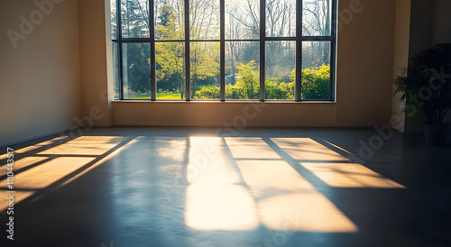 The watermark will not be included on Canvas Print.: Sunlight casting geometric shadows in a minimalist indoor space with concrete flooring and a large w
