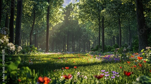 The watermark will not be included on Canvas Print.: Sunlight filters through dense trees casting a golden glow on a vibrant meadow
