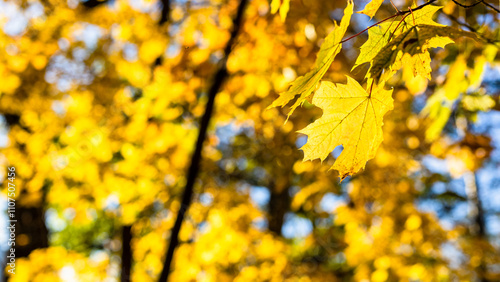 Canvas Prints sunlit yellow maple leaf and leaves in background