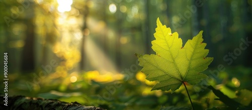 The watermark will not be included on Canvas Print.: Sunlit young green leaf on forest s edge with copy space image