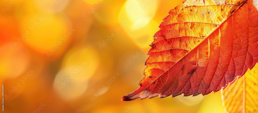 The watermark will not be included on Canvas Print.: Sunny day closeup of a red autumn leaf with copy space image